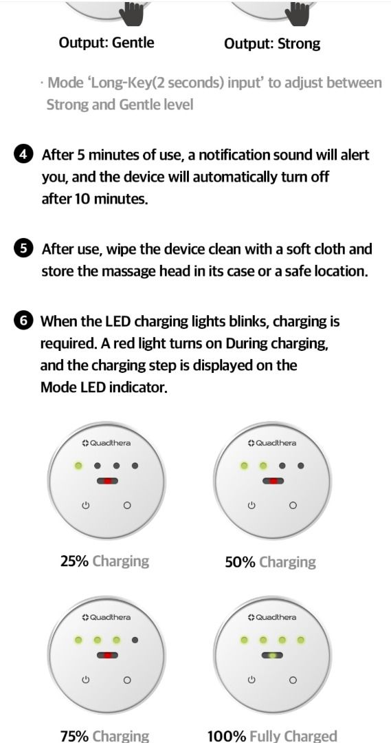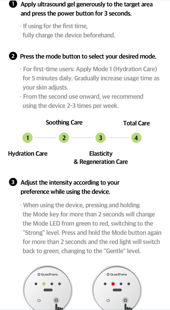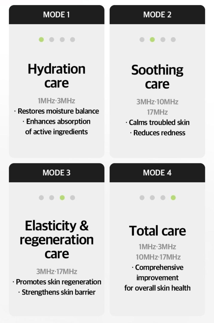 首次使用者:建議每日使用模式1(補水護理)5分鐘。隨著皮膚適應逐漸增加使用時間。